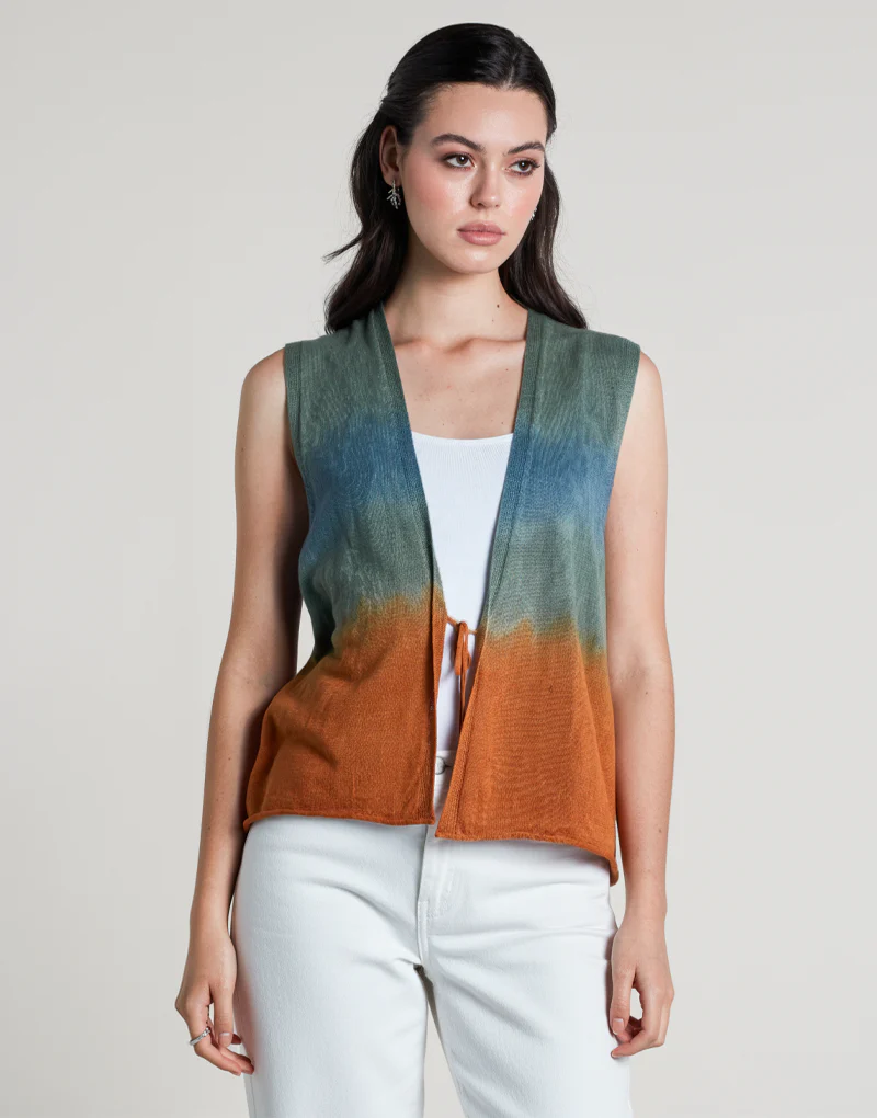 El Ada Vest es una declaración de estilo relajado y sofisticado. Confeccionado en una exquisita mezcla de lino y algodón orgánico, este chaleco destaca por su textura suave, caída fluida y estampado tipo tie-dye que evoca frescura y libertad. Su diseño sin mangas, con escote en V y amarre frontal, ofrece una silueta ligera ideal para estilismos elegantes en días soleados.