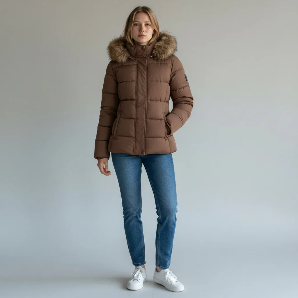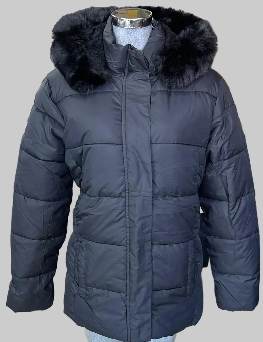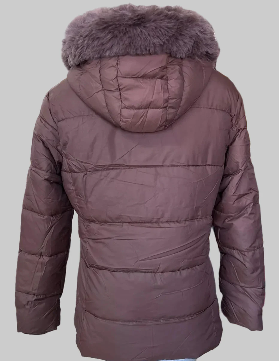 Chamarra térmica Lee Hanton LJ327 para dama, con diseño acolchado tipo puffer, corte a la cadera y gorro forrado con peluche suave. Perfecta para invierno.