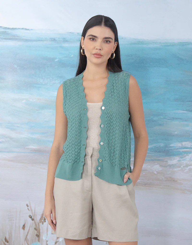Chaleco cuello V abierto con cerramiento de botones de concha de nacar, tejido con una especial combinación de fibras de algodón orgánico y tencel que aporta suavidad y frescura al vestir. El tejido Pointelle da el look romántico y femenino para llevar contigo esta temporada