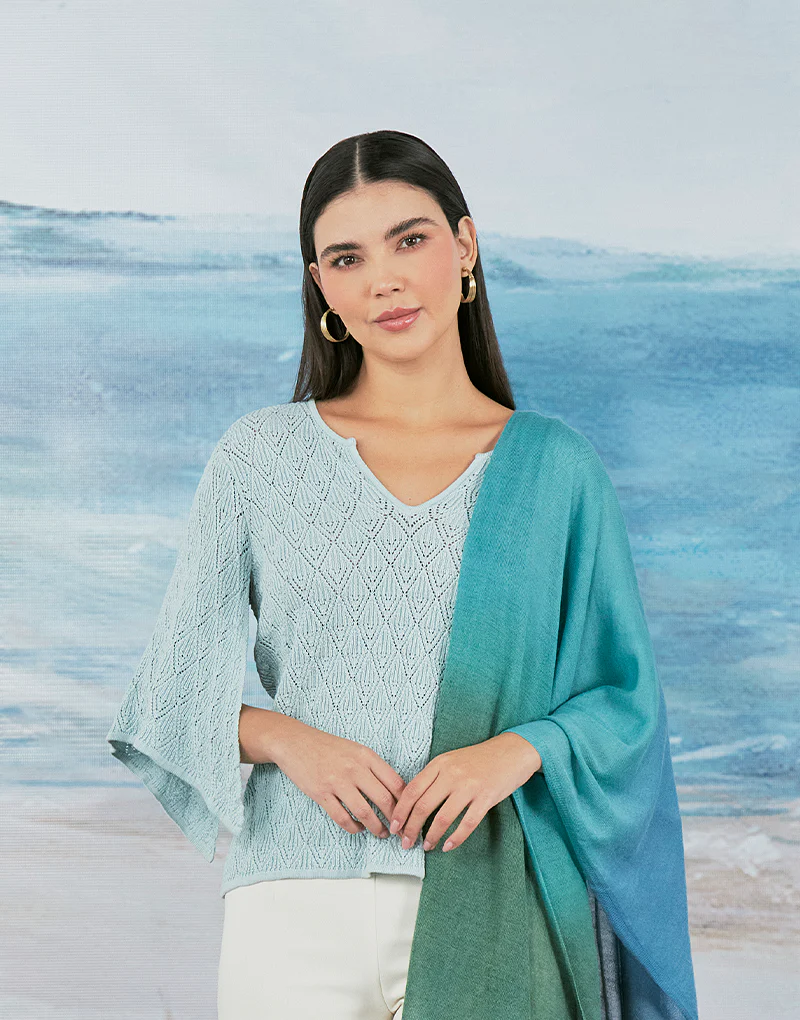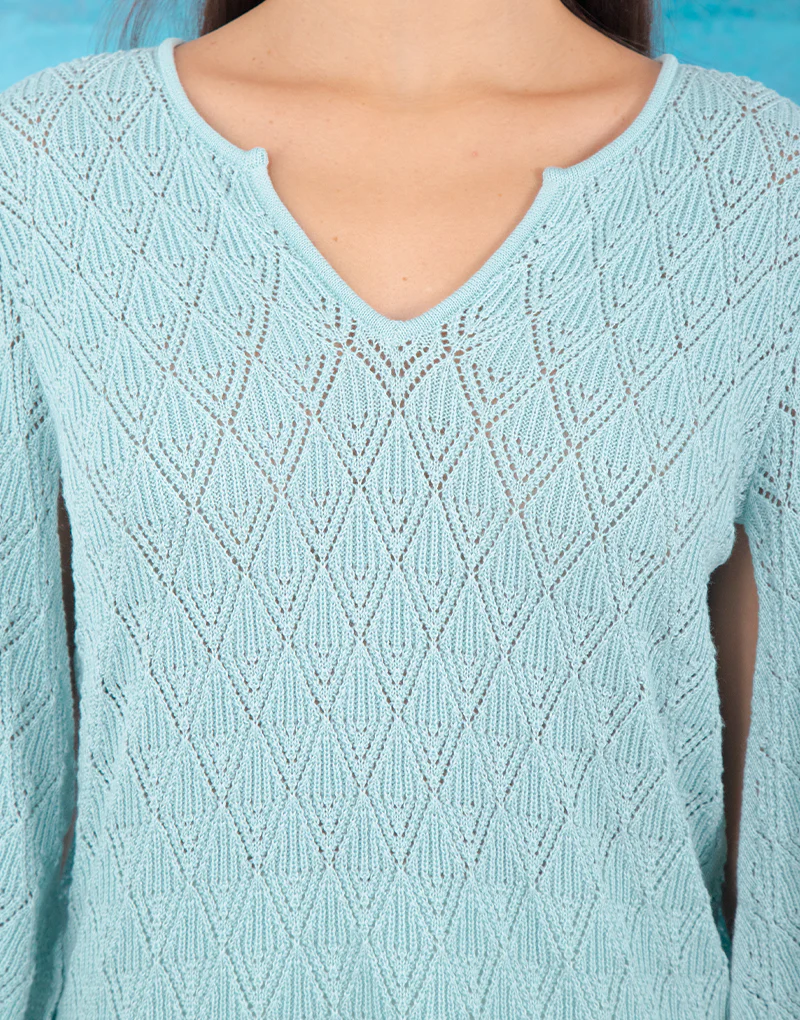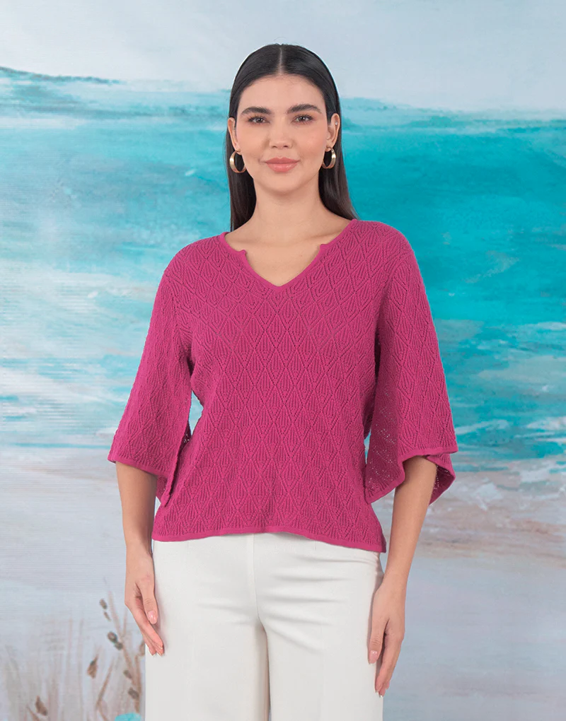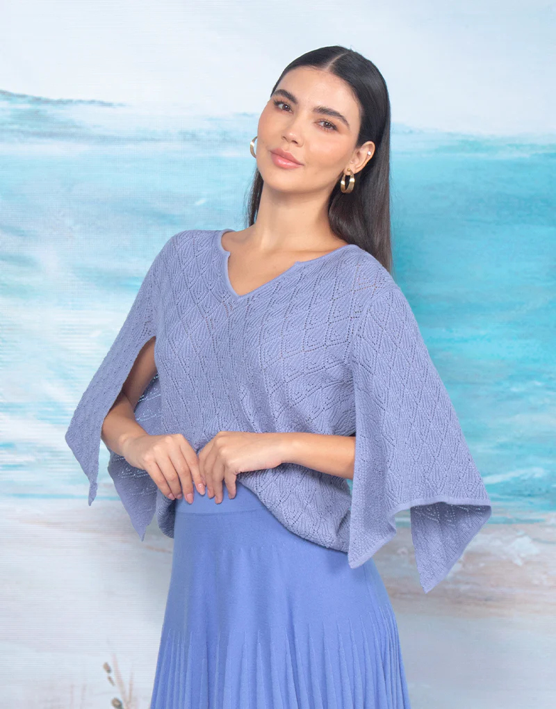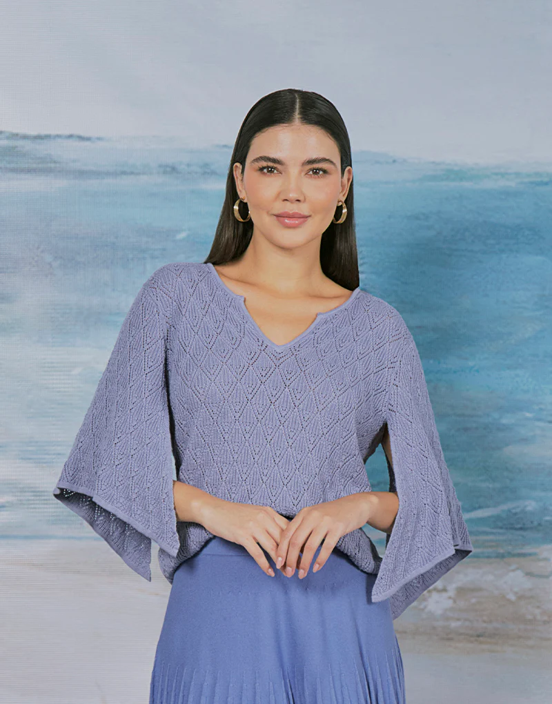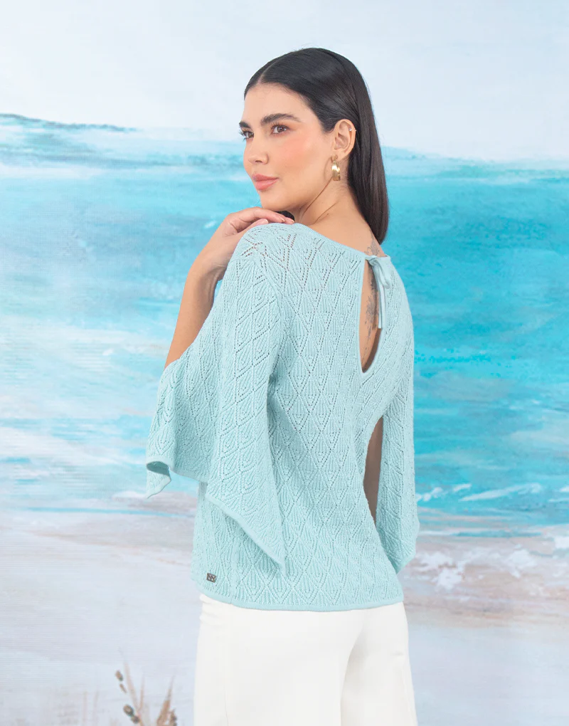 Top tejido. Tiene un escote estilo gota en la parte frontal y espalda. El escote lleva 2 lazos tejidos para entallar. Las mangas con vuelo asim茅trico le otorga un corte femenino y rom谩ntico el cual se complemente con tejido Pointelle para dar un look delicado y aportar frescura al vestir para esta temporada.