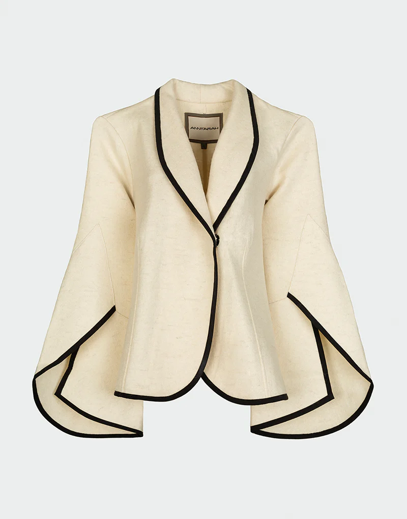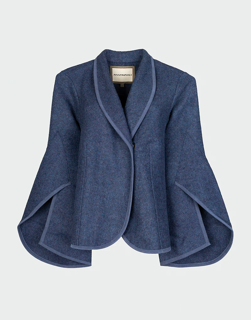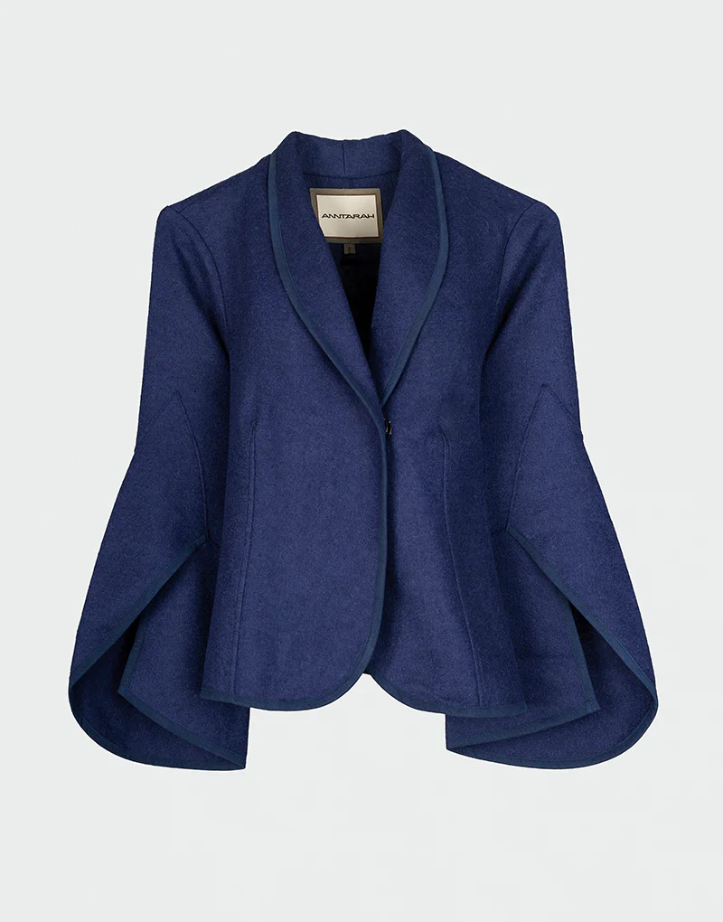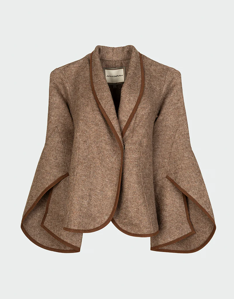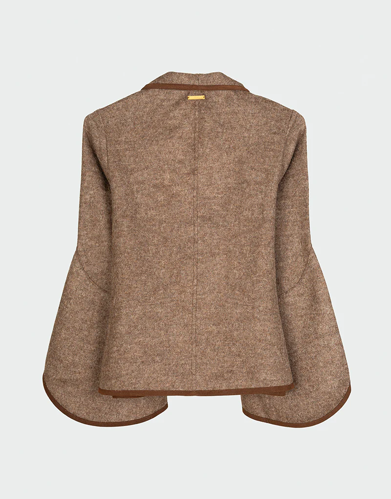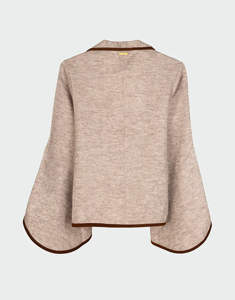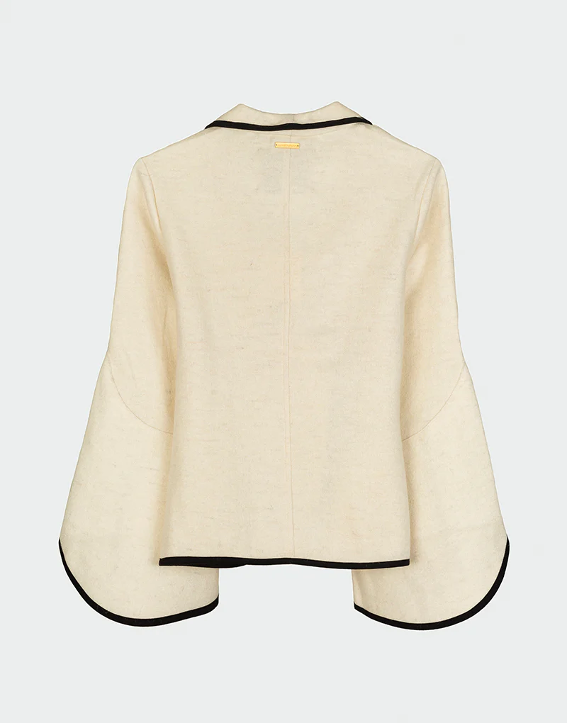 La chaqueta Mad es una pieza de diseño escultural y movimiento fluido. Confeccionada en una mezcla premium de fibras orgánicas, destaca por su silueta abierta, mangas acampanadas tipo capa y acabados en contraste que aportan estructura y definición. Su corte asimétrico y caída elegante la convierten en una prenda versátil y atemporal, ideal para acompañar estilismos de media estación con una estética refinada.