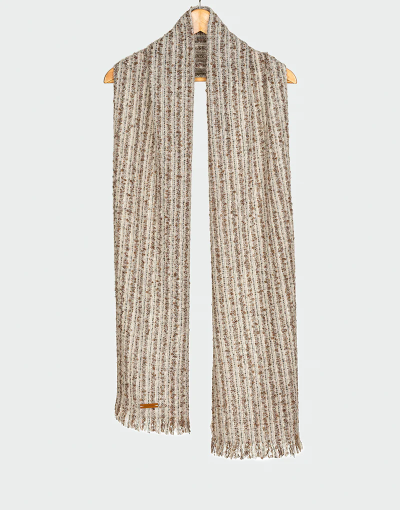 Su tejido muestra un diseño texturizado en tonos neutros, generando un efecto visual envolvente y elegante. Gracias a su longitud y estructura firme, puede usarse como bufanda clásica o envuelta varias veces para máxima protección térmica.