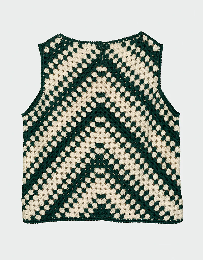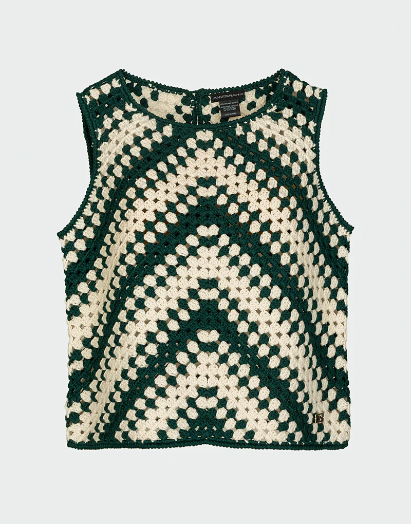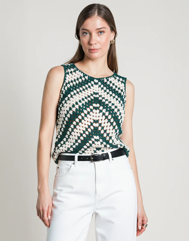 El Violeta Top es una expresi贸n refinada del arte en crochet. Tejido a mano en 100% algod贸n org谩nico, destaca por su patr贸n geom茅trico en tonos verdes y marfil que evocan naturalidad y elegancia.